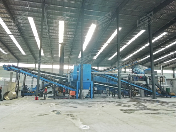 筛上物料则进入颚式破碎机进行粗碎,粗碎后的物料通过皮带机再次输送至人工分拣皮带。在人工分拣前,物料会经过悬挂在皮带机上的永磁除铁器,有效去除其中的钢筋等金属杂质。经过人工仔细分拣,去除大块木材、塑料等杂物后,干净的物料进入一级风选机,去除部分轻物质。